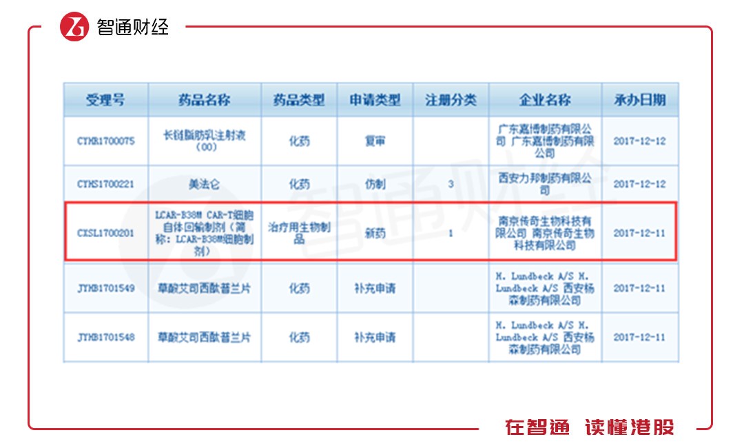 到2017年12月11日,傳奇生物提交CAR-T療法中國(guó)臨床申請(qǐng)(CXSL1700201)獲得CDE正式承辦受理,成為國(guó)內(nèi)首個(gè)獲得受理的CAR-T產(chǎn)品。同月18日,藥品評(píng)審中心公布第二十五批優(yōu)先審評(píng)審批名單,傳奇生物的LCAR-B38MCAR-T細(xì)胞自體回輸制劑獲準(zhǔn)進(jìn)入。2018年3月12日獲CFDA臨床審批完畢。