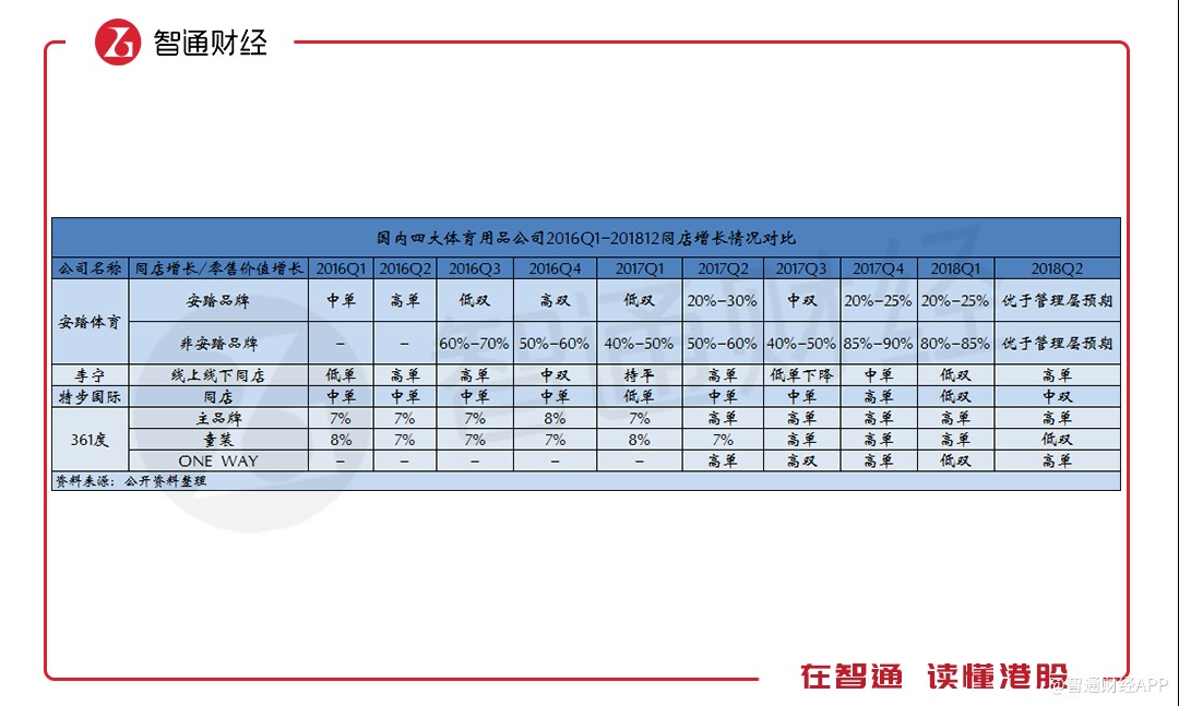 智通財經(jīng)APP根據(jù)公開資料整理發(fā)現(xiàn),特步過往季度的同店銷售增長水平時常保持在中單位數(shù)甚至低單位數(shù)的增長水平,直到2018年一季度才實現(xiàn)低雙位數(shù)增長,這也是公司自2013年一季度開始披露這一數(shù)據(jù)以來,首次達(dá)到雙位數(shù)增長。