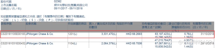 智通財(cái)經(jīng)APP獲悉,根據(jù)聯(lián)交所資料顯示,摩根大通于10月31日減持舜宇光學(xué)科技(02382)333萬(wàn)股,每股作價(jià)約68.27港元,總值2.27億港元,最新持股量減至5.76%。