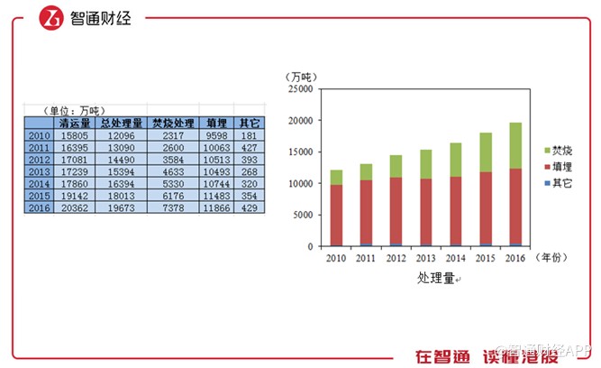 智通財經(jīng)APP統(tǒng)計到,2010至2016年,生活垃圾清運(yùn)量和處理量由15805、12096萬噸增長至20362、19673萬噸,無害化處理率由76.5%增至96.6%,可見垃圾處理率得到了明顯提高。