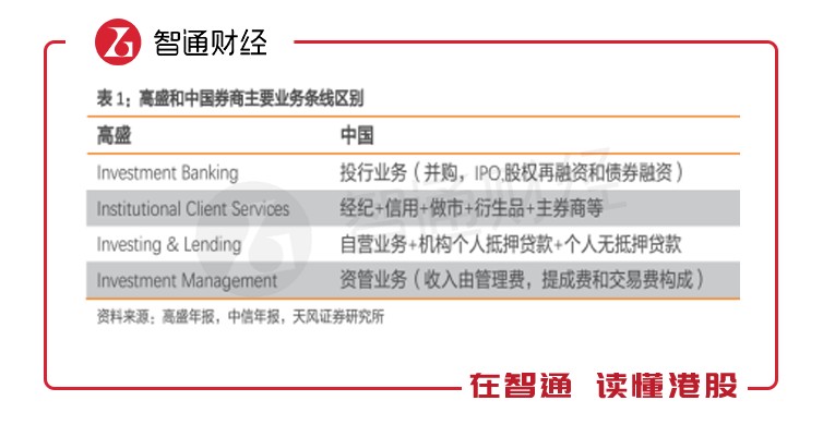 在業(yè)績對比前,我們先了解下美國券商的營業(yè)收入結構,以高盛為例,高盛在3季報中公司業(yè)務分為四個板塊,這四個板塊跟中國券商的業(yè)務對照如下: