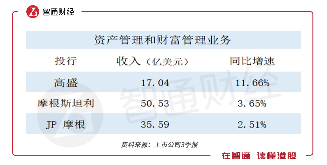 由于JP摩根有大部分營業(yè)收入來自商業(yè)銀行的業(yè)務,而高盛和摩根斯坦利則幾乎沒有。為了更有針對性地對比,智通財經APP只統(tǒng)計JP摩根中的“公司和投資銀行”和“資產和財富管理”這兩個板塊業(yè)務的數(shù)據(jù)。