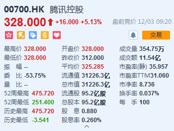 藍籌方面,騰訊(00700)早盤漲5.13%,報328港元,大市盤前成交額為11.54億港元。其他重磅藍籌方面,瑞聲科技(02018)漲5.95%,報58.75港元,中海油(00883)漲5.86%,報14.08港元,中石油(00386)漲4.92%,報5.76港元,中石化(00386)漲3.76%,報6.9港元。