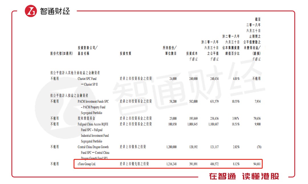 值得一提的是,中民金融的重大投資中,其于今年4月份才投資的eToro,截至2018年上半年期間的公平值變動未變現(xiàn)損益為9468萬港元,而該項投資僅占其資產(chǎn)總值的8.12%。