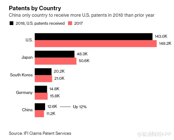 2018年,中國公司的發(fā)明獲得了12589項美國專利,同比增長12%,比十年前的1223項專利增長了10倍之多。美國在這一領域仍占主導地位,去年美國頒發(fā)的308853項公用事業(yè)專利中有46%是來自美國公司,其次是日本、韓國和德國的公司。