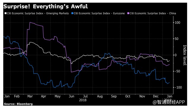 兩位分析師表示,歐洲和新興市場(chǎng)的經(jīng)濟(jì)驚喜指數(shù)均陷入負(fù)值區(qū)間。而標(biāo)普500指數(shù)成份股公司約有三分之一的營(yíng)收來(lái)自海外,海外市場(chǎng)的進(jìn)一步疲軟可能最終會(huì)令美國(guó)國(guó)內(nèi)的增長(zhǎng)前景變得黯淡。此外,美國(guó)國(guó)內(nèi)的經(jīng)濟(jì)增長(zhǎng)前景在一定程度上也已經(jīng)因美國(guó)政府部分關(guān)門(mén)而減弱。