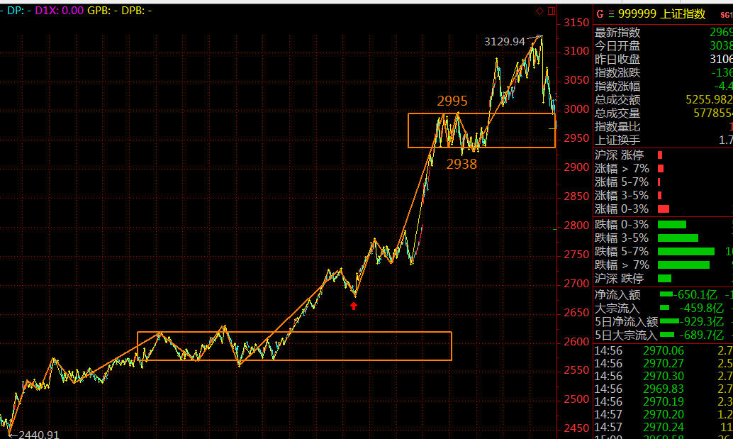 可以很明顯的看出,這是一波五分鐘級(jí)別的雙中樞上漲,這波上漲隨著周五尾盤跌入2995點(diǎn)結(jié)束。市場(chǎng)在后續(xù)的演化過(guò)程中會(huì)做出選擇:開(kāi)始五分鐘級(jí)別下跌趨勢(shì),或者圍繞著五分鐘上漲趨勢(shì)的最后一個(gè)中樞進(jìn)行行情級(jí)別擴(kuò)張。不論哪種情況,從纏論的視角,短期這輪上漲趨勢(shì)暫告一段落,3129.94點(diǎn)即是五分鐘趨勢(shì)的第一類賣點(diǎn),在下周,市場(chǎng)企穩(wěn)后,大概率會(huì)上沖構(gòu)建第二類賣點(diǎn)。