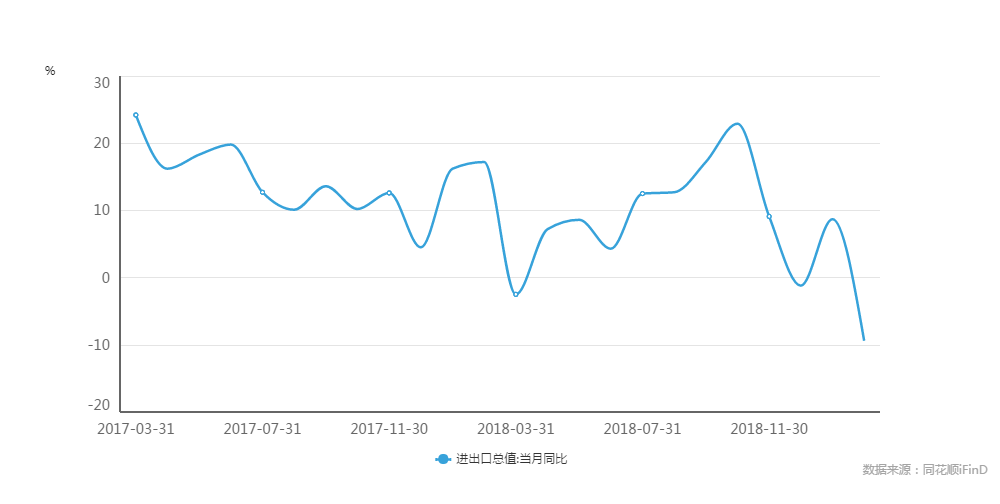 同時(shí),進(jìn)出口數(shù)據(jù)持續(xù)低迷。中國(guó)海關(guān)總署3月8日公布數(shù)據(jù)顯示,2019年2月,我國(guó)進(jìn)出口總值2663.6億美元,同比增長(zhǎng)-13.8%。其中出口1352.4億美元,同比增長(zhǎng)--20.7%;進(jìn)口1311.2億美元,同比增長(zhǎng)-5.2%。