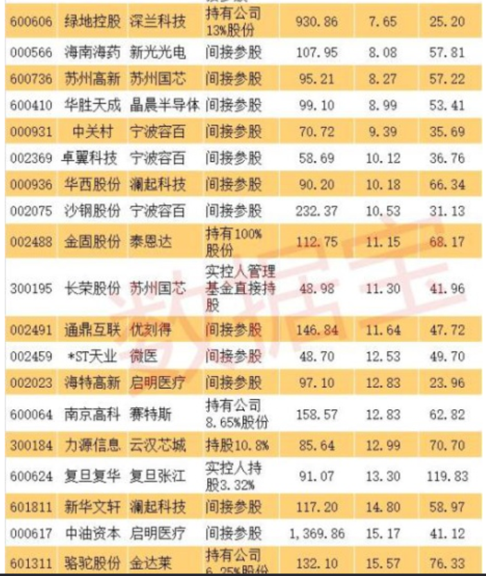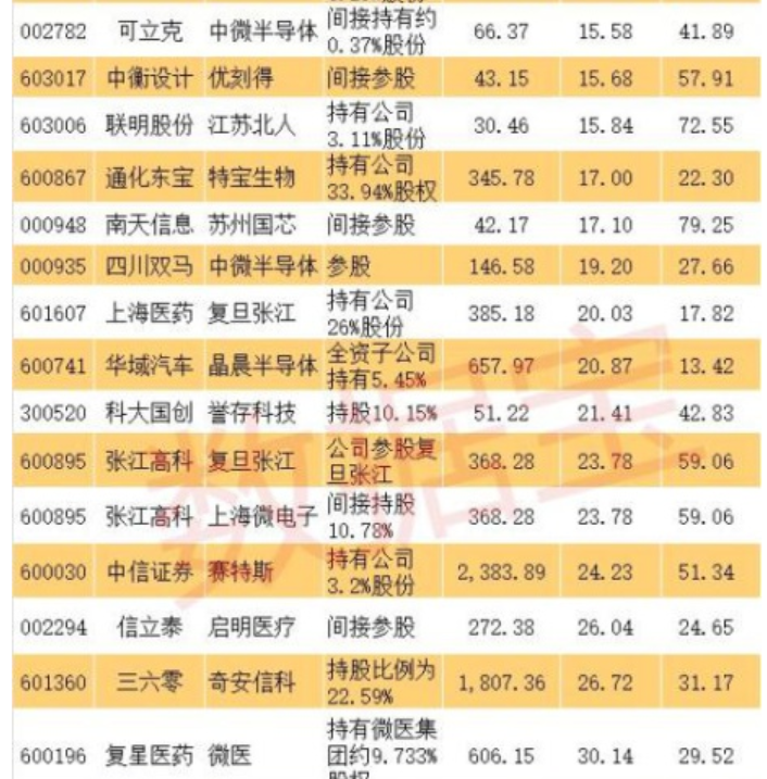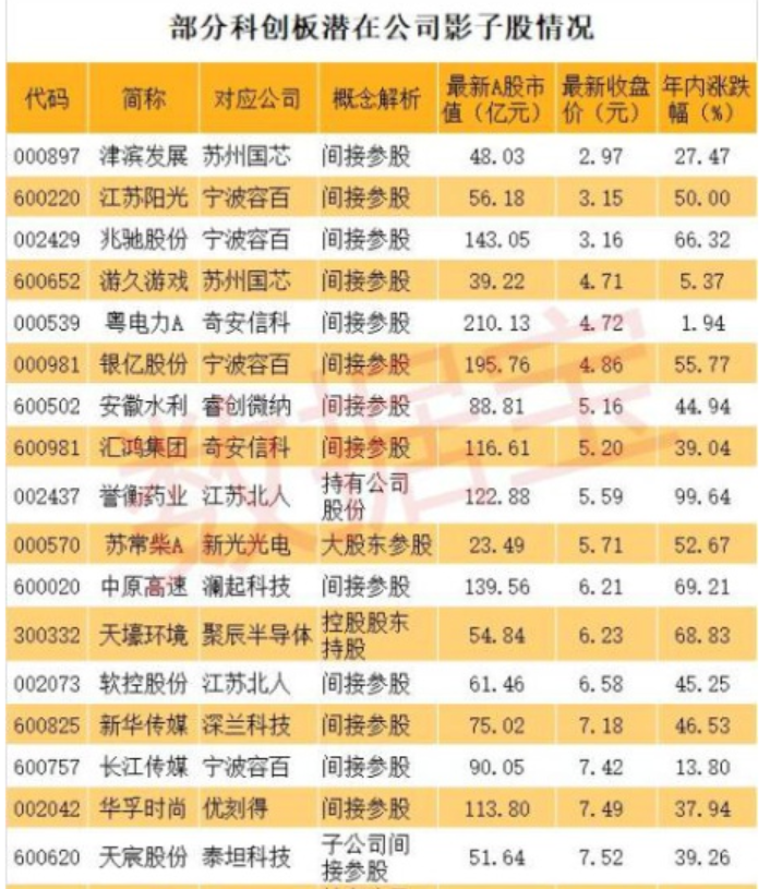 科創(chuàng)板影子股:首批創(chuàng)業(yè)板潛在公司背后有超過50只影子股,而這些影子股大多是間接持股。從持股比例來看,最大的是金固股份,持有泰恩達100%股權(quán)。其他影子股持股比例較大的還有,通化東寶持有33.94%特寶生物、上海醫(yī)藥持有26%復(fù)旦張江、三六零持有22.59%奇安信科、張江高科間接持有10.78%上海微電子、綠地控股持有13%深蘭科技、力源信息持有10.8%云漢芯城、科大國創(chuàng)持有10.15%譽存科技、南京高科持有8.65%賽特斯、駱駝股份持有6.25%金達萊等。