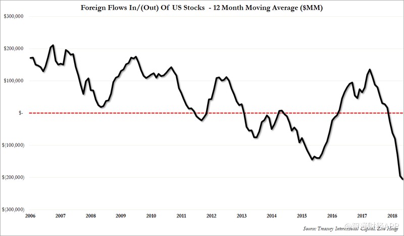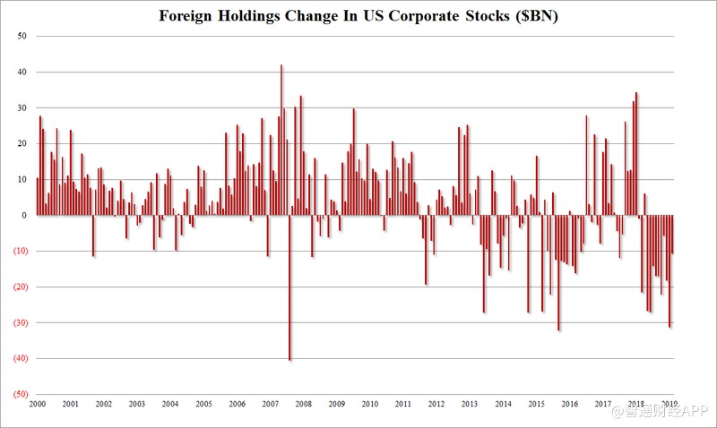 根據(jù)TIC數(shù)據(jù)顯示,外國(guó)投資者連續(xù)第10個(gè)月和過去13個(gè)月中的12個(gè)月賣出美國(guó)股票,創(chuàng)歷史新高: