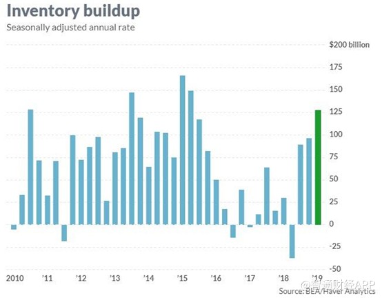 美國(guó)官方表示,1季度的增長(zhǎng)超出了預(yù)期,部分原因是強(qiáng)勁的庫(kù)存增長(zhǎng)。根據(jù)政府的數(shù)據(jù),本季度新增商品庫(kù)存320億美元,折合年率為1280億美元,推動(dòng)了GDP增長(zhǎng)約70個(gè)基點(diǎn)。