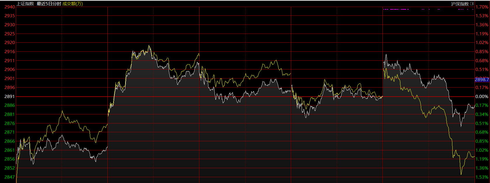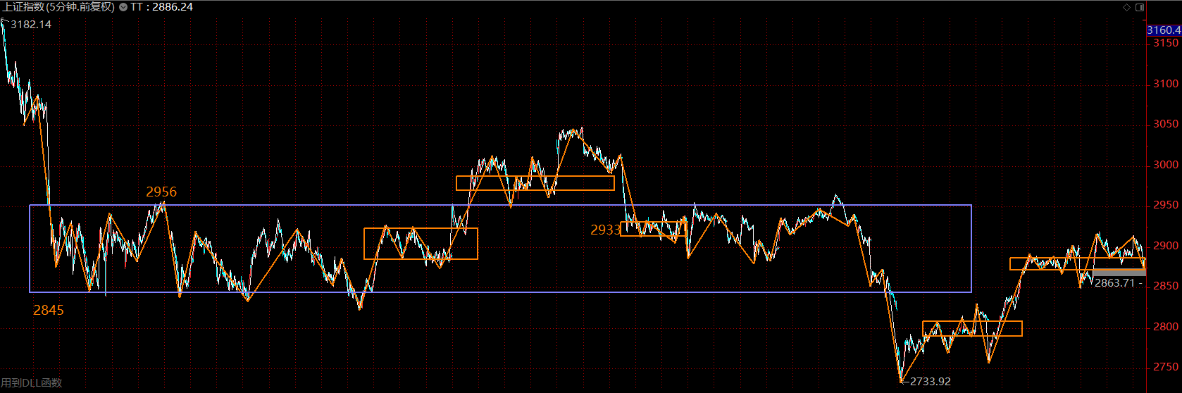 上證指數(shù)上周在這個位置做中樞擴(kuò)展,將五分鐘上漲的第二個中樞擴(kuò)展為三十分鐘級別的。這是強(qiáng)勢的一種表現(xiàn),市場在震蕩中消化拋壓。這里需關(guān)注大中樞的下軌2845點(diǎn),跌破后,可能會帶來指數(shù)的二次探底,這將是絕佳的加倉點(diǎn)位,不跌破則市場隨時會上攻2950點(diǎn)。目前態(tài)勢下,應(yīng)以持倉為主。
