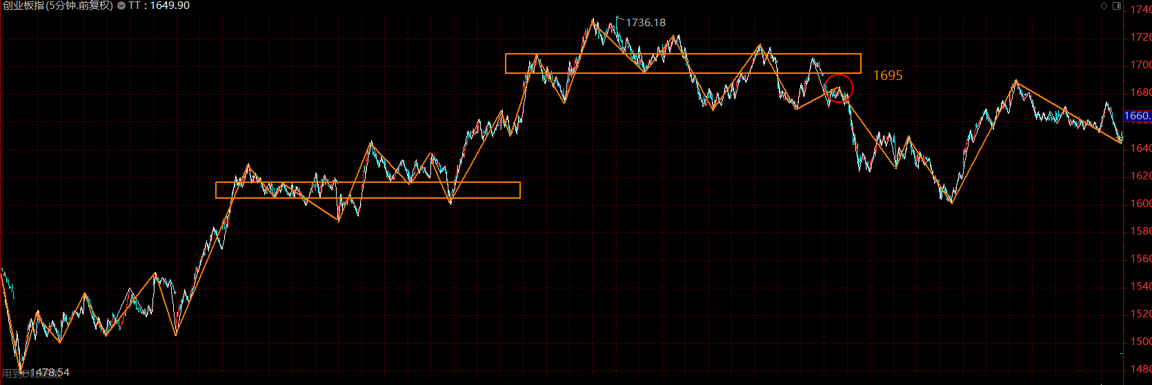 創(chuàng)業(yè)板依舊被上方五分鐘中樞下軌1695點壓制,回踩段連線段都沒有構(gòu)成,比較弱勢。本周初的反抽如果不能站上1695點,大概率還要繼續(xù)回落,完成結(jié)構(gòu)。