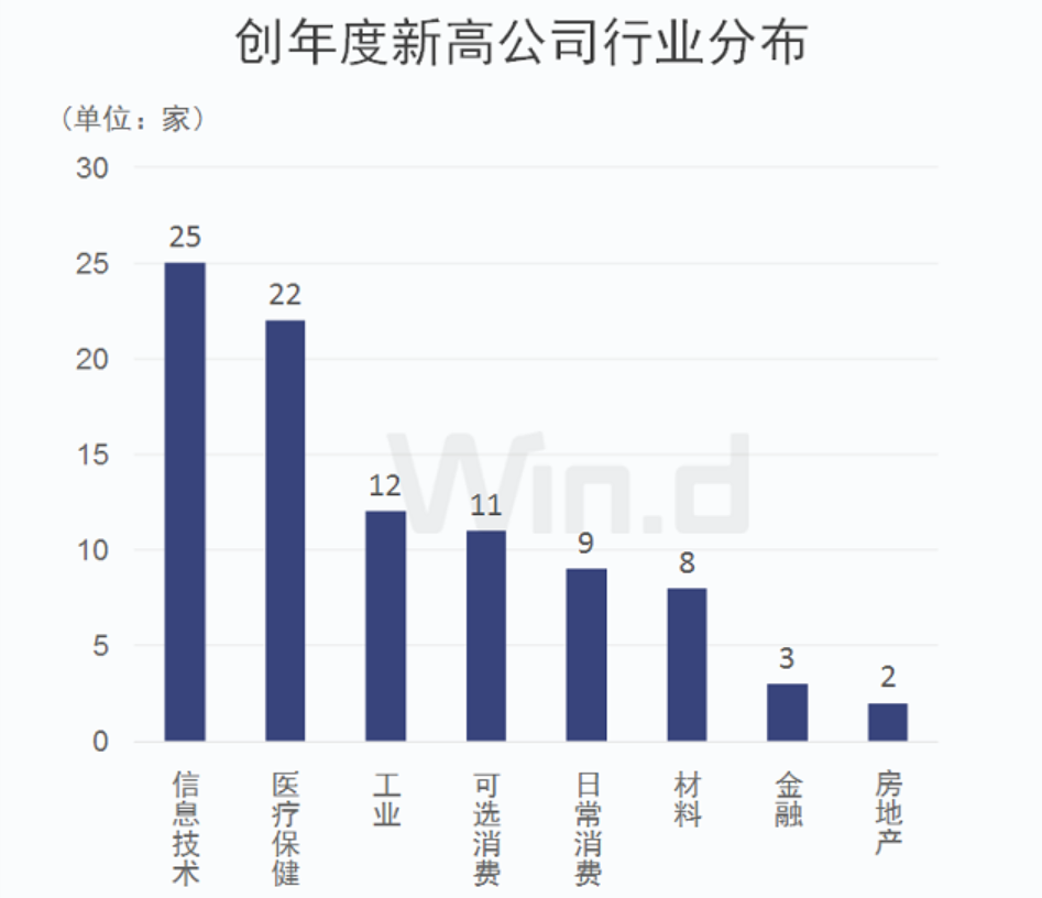 Wind統(tǒng)計顯示,有92家公司近3日最高股價創(chuàng)今年以來新高。從相關(guān)公司行業(yè)分布來看,信息技術(shù)類最多,有25家;醫(yī)療保健行業(yè)緊隨其后,有22家,工業(yè)、可選消費均有超過10家公司。可見,科技和生物醫(yī)藥類公司成為牛股聚集地。