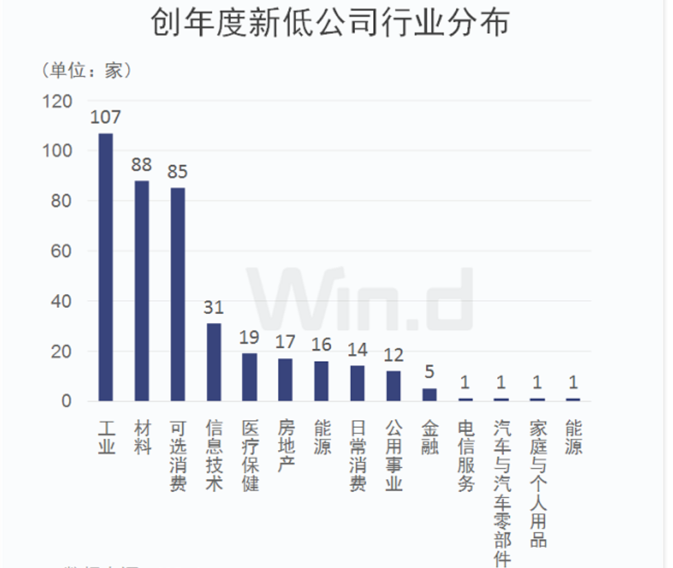 Wind統(tǒng)計顯示,有395家公司近3日最低股價創(chuàng)今年以來新低。從相關(guān)公司行業(yè)分布來看,工業(yè)最多,有107家,材料和可選消費均有超過80家??梢?,雖然股指整體上漲,但傳統(tǒng)工業(yè)、材料領(lǐng)域投資者普遍不太看好。