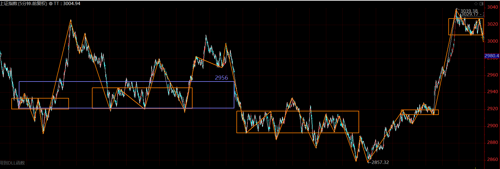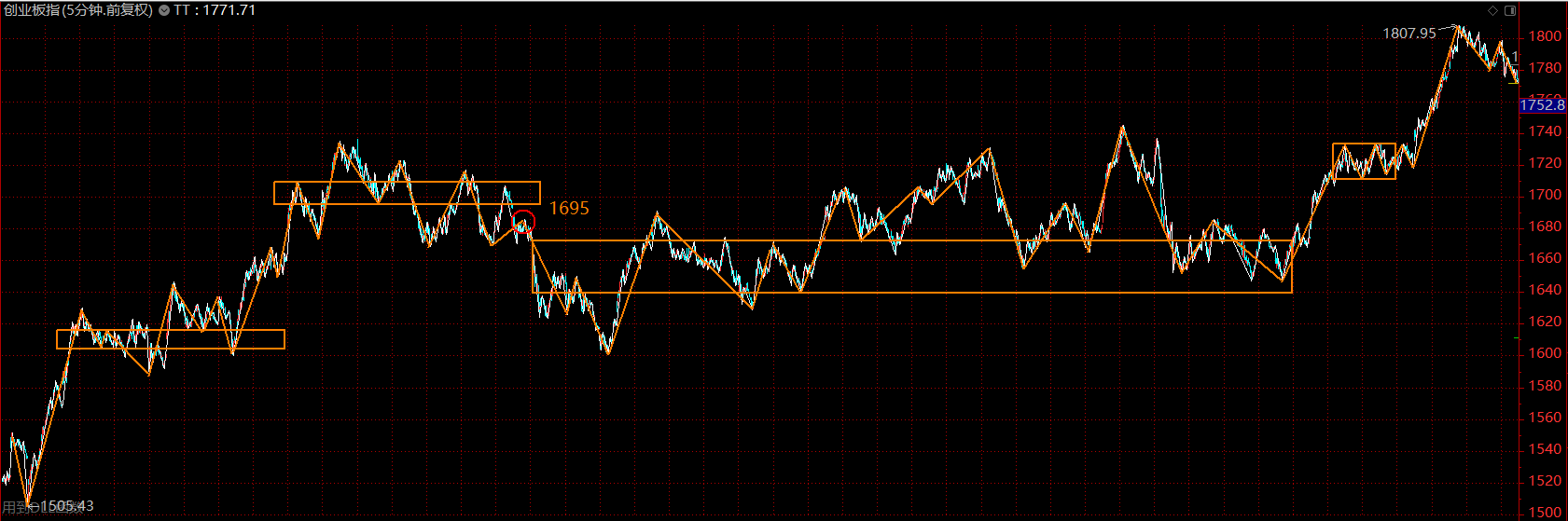 目前分析只需集中于這個(gè)五分鐘的上漲趨勢(shì)即可,上周如期做出了五分鐘上漲趨勢(shì)第二個(gè)中樞的雛形。前面幾天表現(xiàn)其實(shí)蠻超預(yù)期的,特別是科技股的逼空,A股似乎許久未見(jiàn)了。核心問(wèn)題出在周五,周五有兩個(gè)點(diǎn)顯示出當(dāng)下市場(chǎng)的外強(qiáng)中干,第一個(gè)在于周五早盤(pán)南京證券反包漲停時(shí),市場(chǎng)資金的失衡,明顯看出科技股與券商股兩臺(tái)“抽水機(jī)”從前幾天的互相配合變成了互相傷害;這一段跳水直接將圖形破壞,強(qiáng)度大的新高背馳可以說(shuō)已經(jīng)沒(méi)有了,那下午上拉無(wú)力后的跳水也就在情理之中。