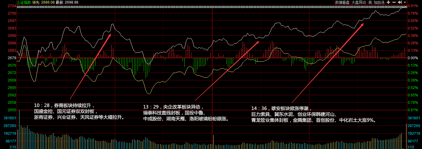 兩市開(kāi)盤(pán)漲跌不一,創(chuàng)業(yè)板明顯弱于主板,ST板塊偃旗息鼓,券商、地產(chǎn)等板塊走強(qiáng)帶動(dòng)滬指上行。午后指數(shù)震蕩走高,雄安新區(qū)尾盤(pán)掀起漲停潮,滬指連漲三日重返2700點(diǎn)。