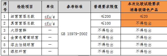 如果衛(wèi)生巾中的微生物指標(biāo)存在問(wèn)題,會(huì)增加女性月經(jīng)期婦科炎癥的風(fēng)險(xiǎn),危害人體健康,我國(guó)《一次性使用衛(wèi)生用品衛(wèi)生標(biāo)準(zhǔn)》(GB15979-2002)中對(duì)致病微生物有嚴(yán)格要求。本次比較試驗(yàn)參照《綠色產(chǎn)品評(píng)價(jià) 紙和紙制品》(GB/T35613-2017)中微生物限值最嚴(yán)格的消毒級(jí)要求(見(jiàn)下表)考核樣品,結(jié)果顯示,35款樣品均可以達(dá)到消毒等級(jí)的要求。
