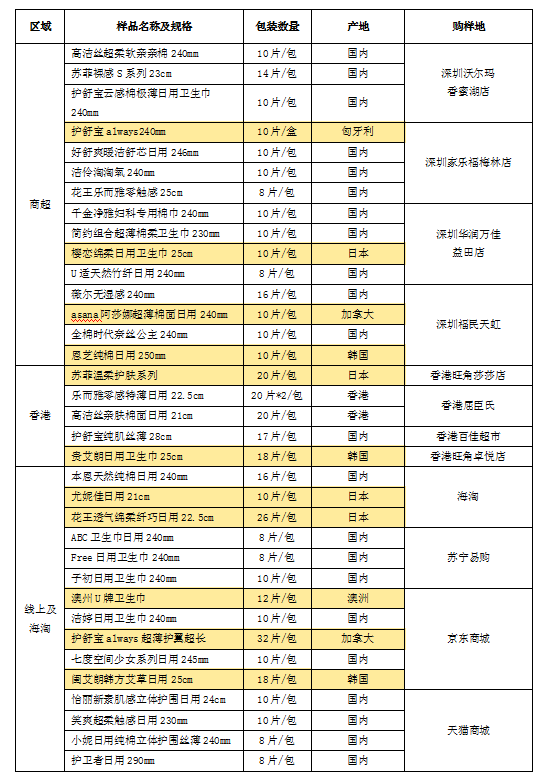 據(jù)前期調(diào)研發(fā)現(xiàn),國(guó)外品牌衛(wèi)生巾更受女性消費(fèi)者青睞,很多消費(fèi)者認(rèn)為國(guó)外品牌衛(wèi)生巾質(zhì)量更優(yōu)更值得信賴,進(jìn)而選擇跨境或海淘等方式購(gòu)買(mǎi)國(guó)外產(chǎn)品。因此,本次樣品分別從深圳商超、香港、線上海淘購(gòu)買(mǎi)樣品進(jìn)行測(cè)試和比較,樣品涉及11款國(guó)外原裝產(chǎn)品。詳見(jiàn)下表。