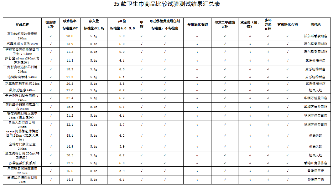 附:衛(wèi)生巾商品比較試驗(yàn)結(jié)果匯總表