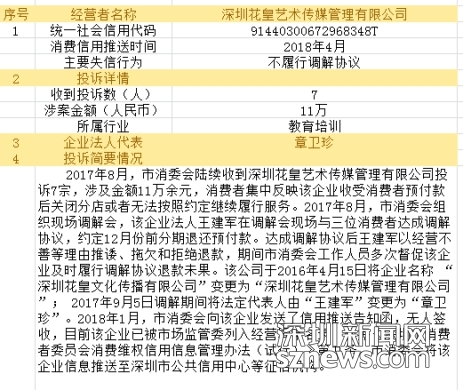 2017年8月,市消委會陸續(xù)收到深圳花皇藝術(shù)傳媒管理有限公司投訴7宗,涉及金額11萬余元,消費者集中反映該企業(yè)收受消費者預(yù)付款后關(guān)閉分店或者無法按照約定繼續(xù)履行服務(wù)。2017年8月,市消委會組織現(xiàn)場調(diào)解會,該企業(yè)法人王建軍在調(diào)解會現(xiàn)場與三位消費者達(dá)成調(diào)解協(xié)議,約定12月份前分期退還預(yù)付款。達(dá)成調(diào)解協(xié)議后王建軍以經(jīng)營不善等理由推諉、拖欠和拒絕退款,期間市消委會工作人員多次督促該企業(yè)及時履行調(diào)解協(xié)議退款未果。該公司于2016年4月15日將企業(yè)名稱 “深圳花皇文化傳播有限公司”變更為“深圳花皇藝術(shù)傳媒管理有限公司”; 2017年9月5日調(diào)解期間將法定代表人由“王建軍”變更為“章衛(wèi)珍”。2018年1月,市消委會向該企業(yè)發(fā)送了信用推送告知函,無人簽收,目前該企業(yè)已被市場監(jiān)管委列入經(jīng)營異常名錄。依據(jù)《深圳市消費者委員會消費維權(quán)信用信息管理辦法(試行)》第九條,市消委會將該企業(yè)信息推送至深圳市公共信用中心等征信機(jī)構(gòu)。該企業(yè)雖然變更了公司名稱和法定代表人等公司信息,但仍需承擔(dān)原企業(yè)未履行的法定或約定義務(wù)。