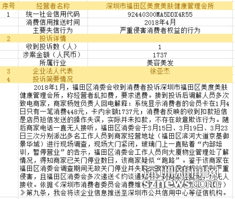 2018年1月,福田區(qū)消委會收到消費者投訴深圳市福田區(qū)美度美膚健康管理會所,稱經(jīng)營者亂扣費,要求退回余額(會員卡余額1737元)。接到投訴后調(diào)解人員多次致電商家,商家楊姓負(fù)責(zé)人回電解釋:系統(tǒng)顯示消費者的會員卡在1月4日只有一筆消費448元,卡內(nèi)余額1737元;消費者反映的收到扣款短信是店員短信發(fā)送的操作失誤,實際并未扣款,不存在故意欺詐行為。隨后商家電話一直無人接聽,福田區(qū)消委會于3月15日、3月19日、3月23日三次分別派出多名工作人員到商家經(jīng)營地址(福田區(qū)濱河大道京基御景華城)進(jìn)行現(xiàn)場調(diào)查,現(xiàn)場大門緊閉,玻璃門上一直貼著“內(nèi)部培訓(xùn),暫停營業(yè)”的告示,福田區(qū)消委會工作人員向大廈物業(yè)管理處了解情況,得知商家已關(guān)門停業(yè)數(shù)日,該商家疑似“跑路”。鑒于該商家在福田區(qū)消委會調(diào)查期間無故關(guān)門停業(yè)并失聯(lián),致使消費者權(quán)益受到嚴(yán)重侵害,且福田區(qū)消委會多次遞送《約談通知書》到商家經(jīng)營地,均無人接收。依據(jù)《深圳市消費者委員會消費維權(quán)信用信息管理辦法(試行)》第九條,我會將該企業(yè)信息推送至深圳市公共信用中心等征信機(jī)構(gòu)。