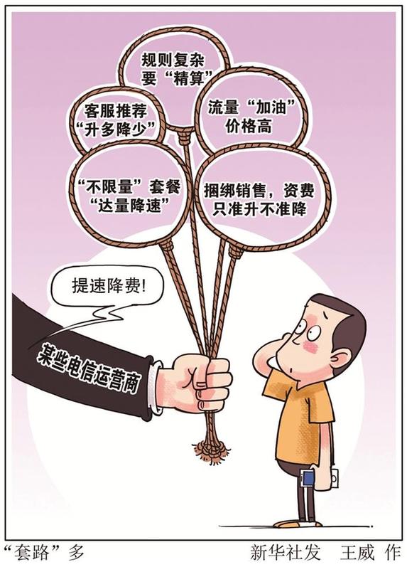 套路五:捆綁銷售,資費(fèi)只準(zhǔn)升不準(zhǔn)降。許多消費(fèi)者在辦理手機(jī)套餐時,運(yùn)營商會贈送寬帶服務(wù),二者資費(fèi)不能單獨(dú)改動。深圳王女士去年辦理了某運(yùn)營商的“136元贈送寬帶”的電信套餐,但套餐內(nèi)流量只有1GB,且不能更換成其他流量資費(fèi)優(yōu)惠的套餐;如果超流量就必須支付30元1GB的“流量包”。王女士每月實(shí)際通訊費(fèi)超過170元。