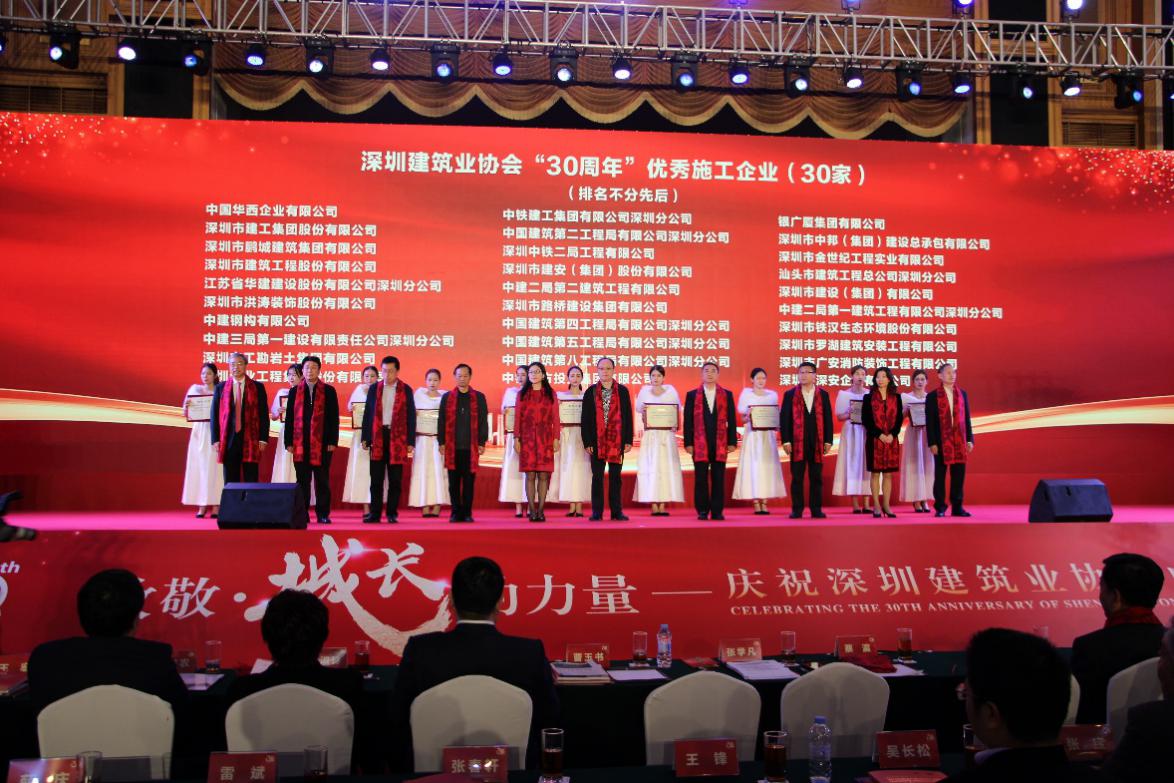 本次慶典上,深圳建筑業(yè)協(xié)會表彰了一批在促進、推動深圳建筑行業(yè)發(fā)展中作出重大貢獻的優(yōu)秀企業(yè)和個人,鼓勵他們不斷探索創(chuàng)新,共同創(chuàng)造深圳建筑業(yè)的輝煌。深圳市建被授予“30周年優(yōu)秀施工企業(yè)”;翠林投資集團董事長王忠明榮獲深圳建筑業(yè)協(xié)會“30周年優(yōu)秀企業(yè)家”稱號;深圳市建員工盧燦光、郝崇民榮獲“30周年優(yōu)秀項目經理”稱號;深圳市建老員工李炳坤榮膺“30周年優(yōu)秀工匠”稱號。