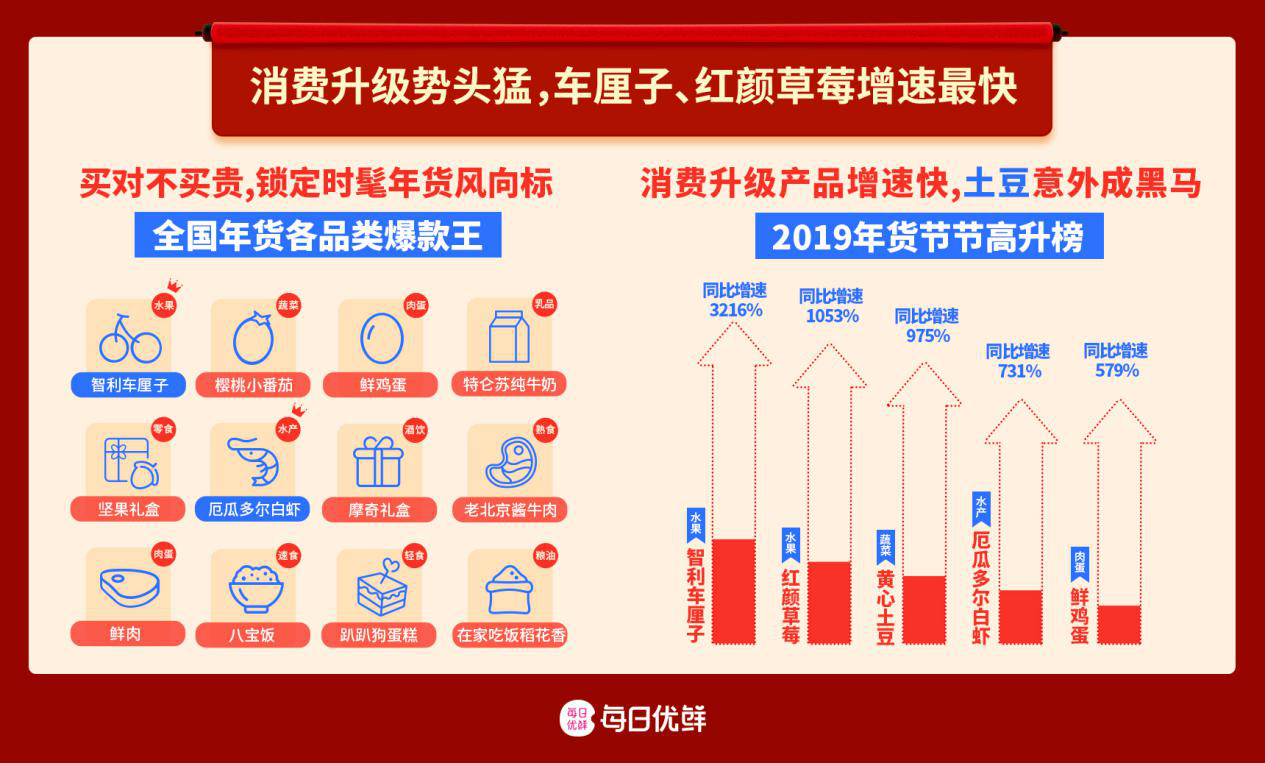 每日優(yōu)鮮華南區(qū)負(fù)責(zé)人告訴記者,智利車?yán)遄釉谌A南區(qū)的銷量已經(jīng)超過(guò)了100萬(wàn)斤,在華南年貨頻道里,水果、肉蛋、酒水等品類占據(jù)“大半壁江山”,高端水果的銷售占比更是從去年的20%激增到50%。除了車?yán)遄樱M(fèi)者還十分喜歡上上簽砂糖桔、臘味禮盒、箱裝牛奶和零食大禮包等。