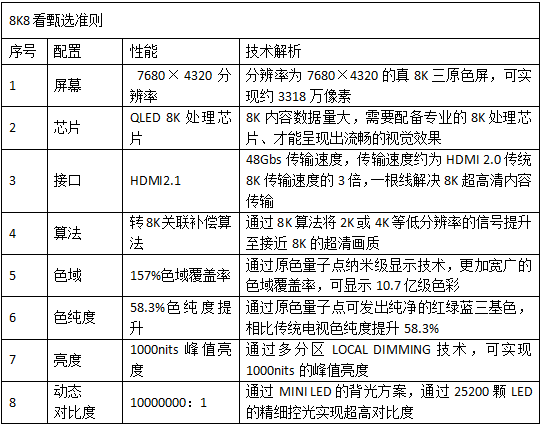 在行業(yè)趨勢(shì)及國家政策的雙重推動(dòng)下,為正確引導(dǎo)8K電視市場(chǎng)發(fā)展方向、加快發(fā)展步伐,TCL聯(lián)合國家廣播電視產(chǎn)品質(zhì)量監(jiān)督檢驗(yàn)中心經(jīng)過長時(shí)間的市場(chǎng)調(diào)研及總結(jié),從行業(yè)整體的角度對(duì)8K電視進(jìn)行了初步探討,并編制出《8K8看甄選白皮書》。這份白皮書告訴我們,實(shí)現(xiàn)真正的8K震撼視覺體驗(yàn)關(guān)鍵性能/技術(shù)要求如下。