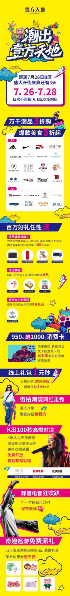 開業(yè)期間,精彩紛呈的活動(dòng)當(dāng)然是必不可少的。7.26-7.28開業(yè)期間,B區(qū)將聯(lián)動(dòng)A區(qū)、E區(qū)開展一系列活動(dòng)。開業(yè)活動(dòng)緊扣B區(qū)定位“潮流品味先鋒主場”,充分抓住當(dāng)下年輕人愛玩、敢玩的特色,將整個(gè)壹方天地變?yōu)槌比ぁ㈧趴岬臍g樂海洋。