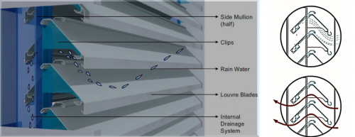除了屋面幕墻的“防水神經(jīng)系統(tǒng)”,令人驚嘆的還有安裝在展館立面幕墻上的“人字形”百葉,這種雙片百葉同時具備50%“空氣通風性能和95%防雨水性能。巧妙的“人字形”設(shè)計,使得風和雨水從百葉片間進入時,能夠保證空氣從向上傾斜的第一片百葉有效進入,而雨水被第二片向下傾斜的百葉擋住,并由葉片分流至兩邊的豎框里,排出下邊框?!叭俗中巍卑偃~不僅能完全阻風防雨,還具備超高強度,足以抵抗臺風暴雨的侵襲。