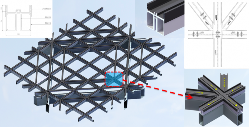 由于每一個小“盒子”的顏色都是獨一無二的,需要在生產(chǎn)階段為每一塊零件編號,并在安裝時按編號一塊一塊進行組合。更讓項目部犯難的是,在根據(jù)原有方案進行樣板安裝時,“盒子”全部下垂,原因是菱形盒子突出內(nèi)層幕墻1米,難以固定支撐。后經(jīng)反復(fù)研究試驗,決定在裝盒子前,在墻上做一個外觀似蜘蛛網(wǎng)的控制體系,為每個菱形盒子準確定位,將安裝精度控制在毫米級。