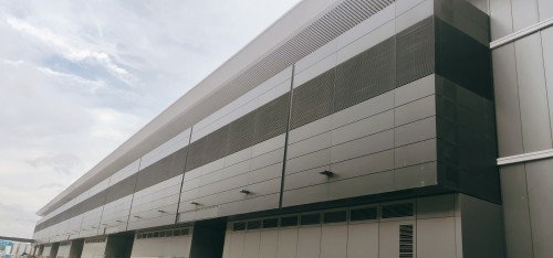 保證了“布料”的質(zhì)量還不行,美觀也很重要。項目部為了選定鋁板的顏色,反復(fù)波奔于鋁板廠,來來回回試驗了十多次才最終有了“高級灰”的呈現(xiàn)。據(jù)介紹,光是6個標準展廳的外立面幕墻,就使用了五萬余塊鋁板,整個展館的鋁板更是不計其數(shù)。為了保證每塊鋁板的質(zhì)量,質(zhì)檢員直接蹲守在鋁板廠3個多月。