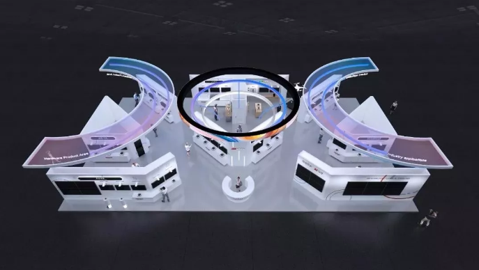 展臺(tái)的吊頂設(shè)計(jì)以“COC”形狀為主體,引發(fā)讀者眾多猜想,包括“CloudOFCity城市之云”、“AICloud三級(jí)架構(gòu)”、“物信融合”、“CalculateOnCloud”等。