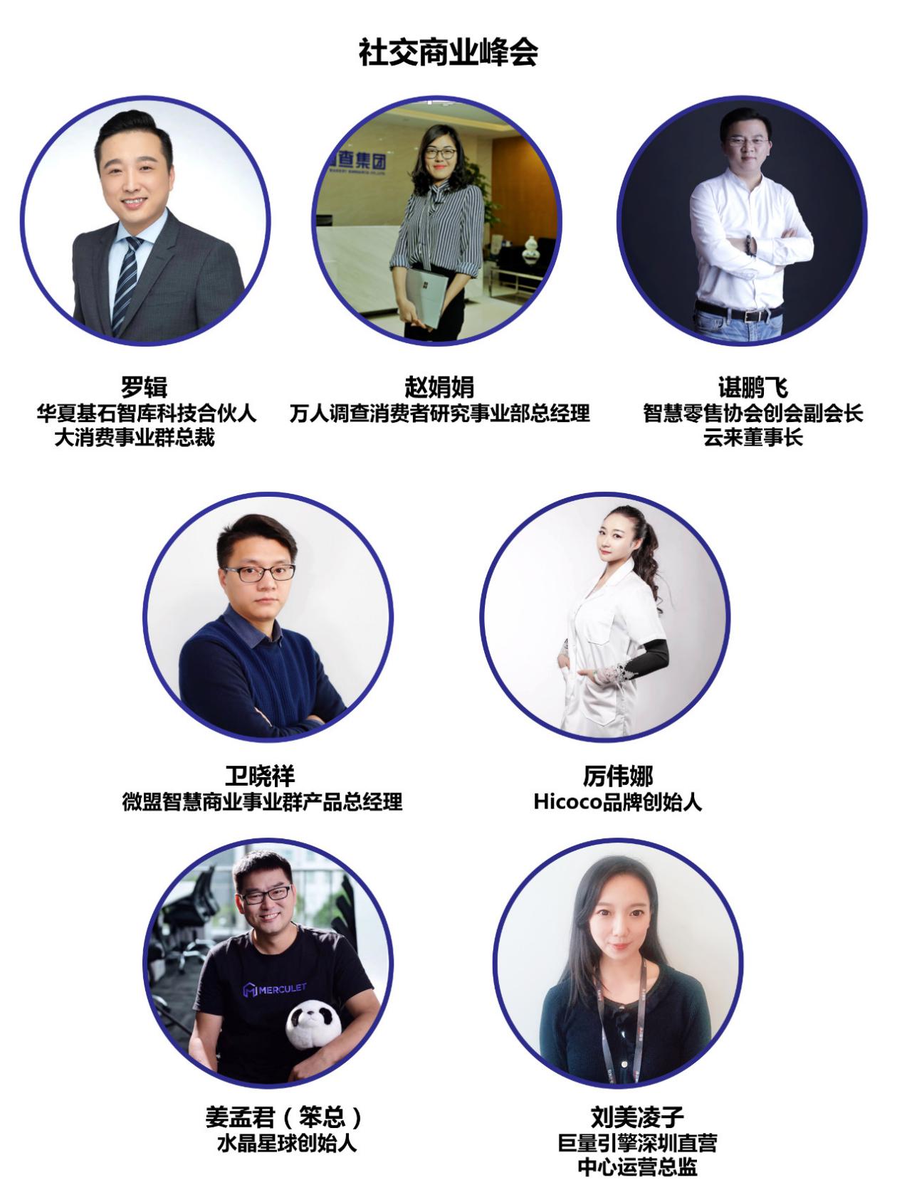 10月30日14:00—17:00(宴會(huì)廳Ⅲ)舉行社交電商峰會(huì),華夏基石智庫科技合伙人、大消費(fèi)事業(yè)群總裁羅 輯主持峰會(huì)。萬人調(diào)查消費(fèi)者研究事業(yè)部總經(jīng)理趙娟娟演講主題《2019年深圳市消費(fèi)者線上線下渠道消費(fèi)洞察》,智慧零售協(xié)會(huì)創(chuàng)會(huì)副會(huì)長(zhǎng)、特聘專家;云來董事長(zhǎng)諶鵬飛演講主題《私域流量社交商業(yè)模式解碼》,微盟智慧商業(yè)事業(yè)群產(chǎn)品總經(jīng)理衛(wèi)曉祥演講主題《企業(yè)布局社交電商的四種模式》,Hicoco品牌創(chuàng)始人厲偉娜演講主題《說說美業(yè)那些事》,水晶星球創(chuàng)始人姜孟君演講主題《社群時(shí)代的影響力和業(yè)績(jī)?cè)鲩L(zhǎng)》,巨量引擎深圳直營(yíng)中心運(yùn)營(yíng)總監(jiān)劉美凌子演講主題《D造營(yíng)銷新零售助力品牌升級(jí)布局》