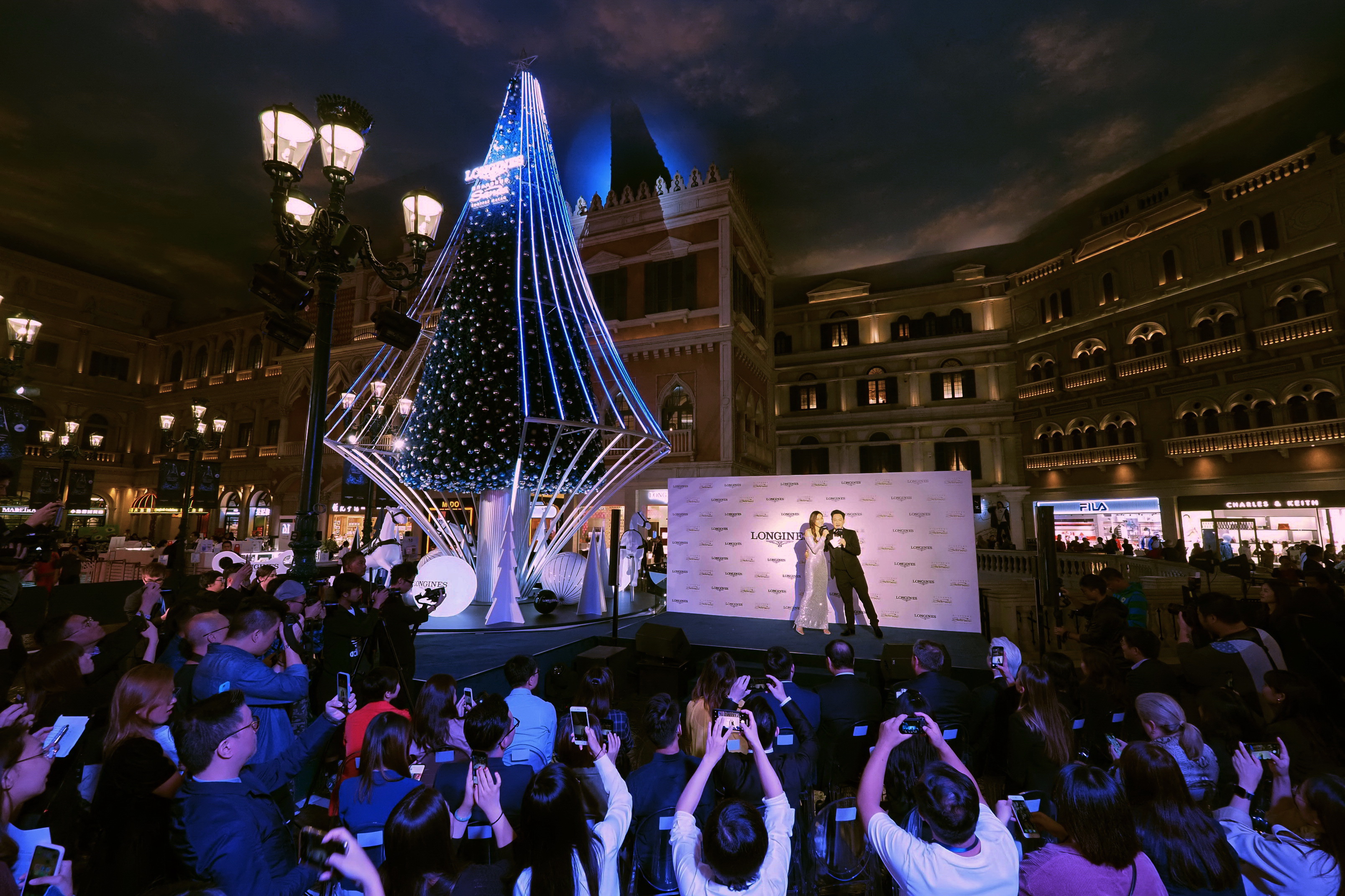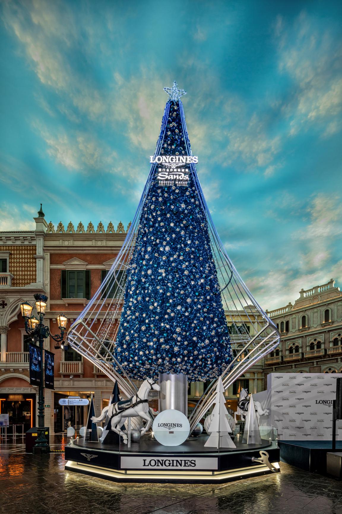 亮燈儀式于威尼斯人購物中心圣馬可廣場舉行,影視明星鐘嘉欣受邀出席,并與浪琴澳門副總裁鄭美齡、金沙中國有限公司零售市場推廣副總裁Rita Simonetta及金沙中國有限公司商場管理部總監(jiān)梁俊強(qiáng)一同啟動高達(dá)13米的藍(lán)色菱形圣誕樹底部的音樂盒裝置。