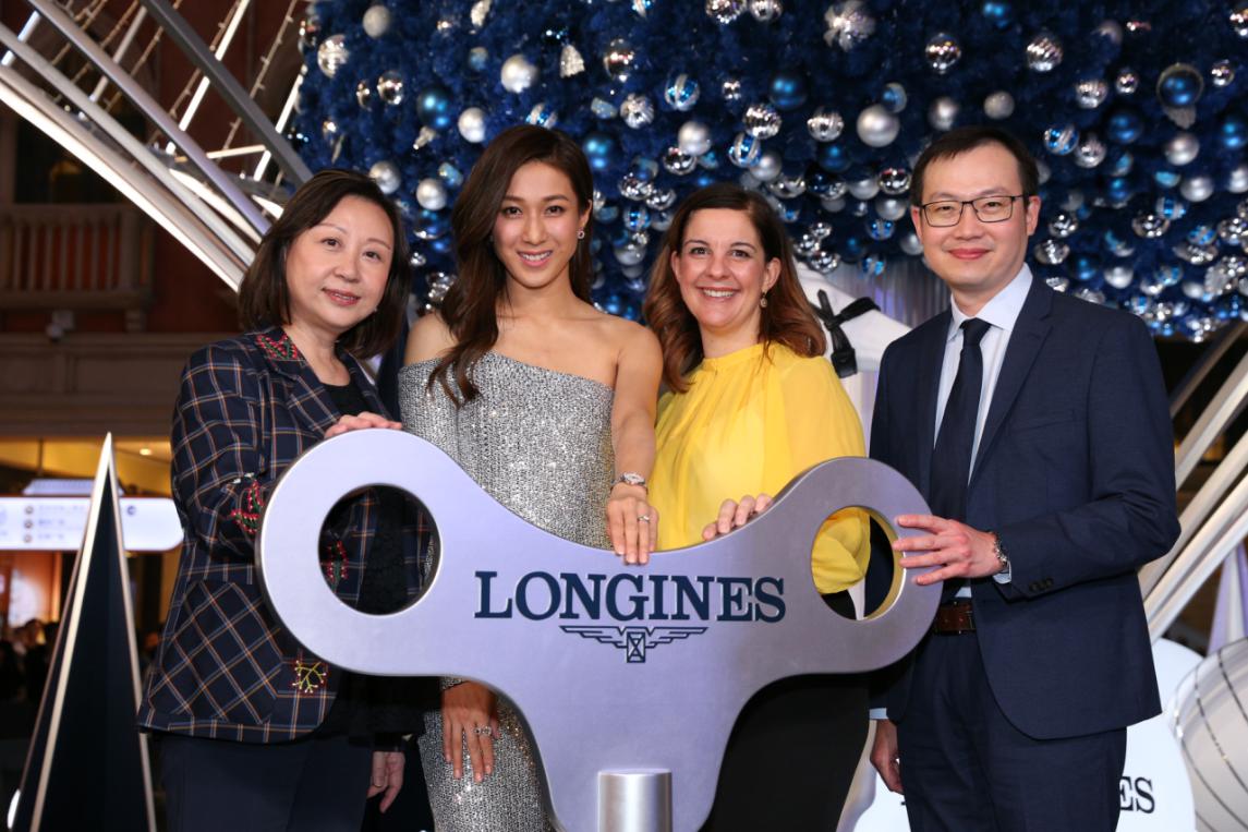 (左起)浪琴澳門副總裁鄭美齡、影視明星鐘嘉欣、金沙中國有限公司零售市場推廣副總裁Rita Simonetta及金沙中國有限公司商場管理部總監(jiān)梁俊強(qiáng)一同啟動高達(dá)13米的藍(lán)色菱形圣誕樹底部的音樂盒裝置。