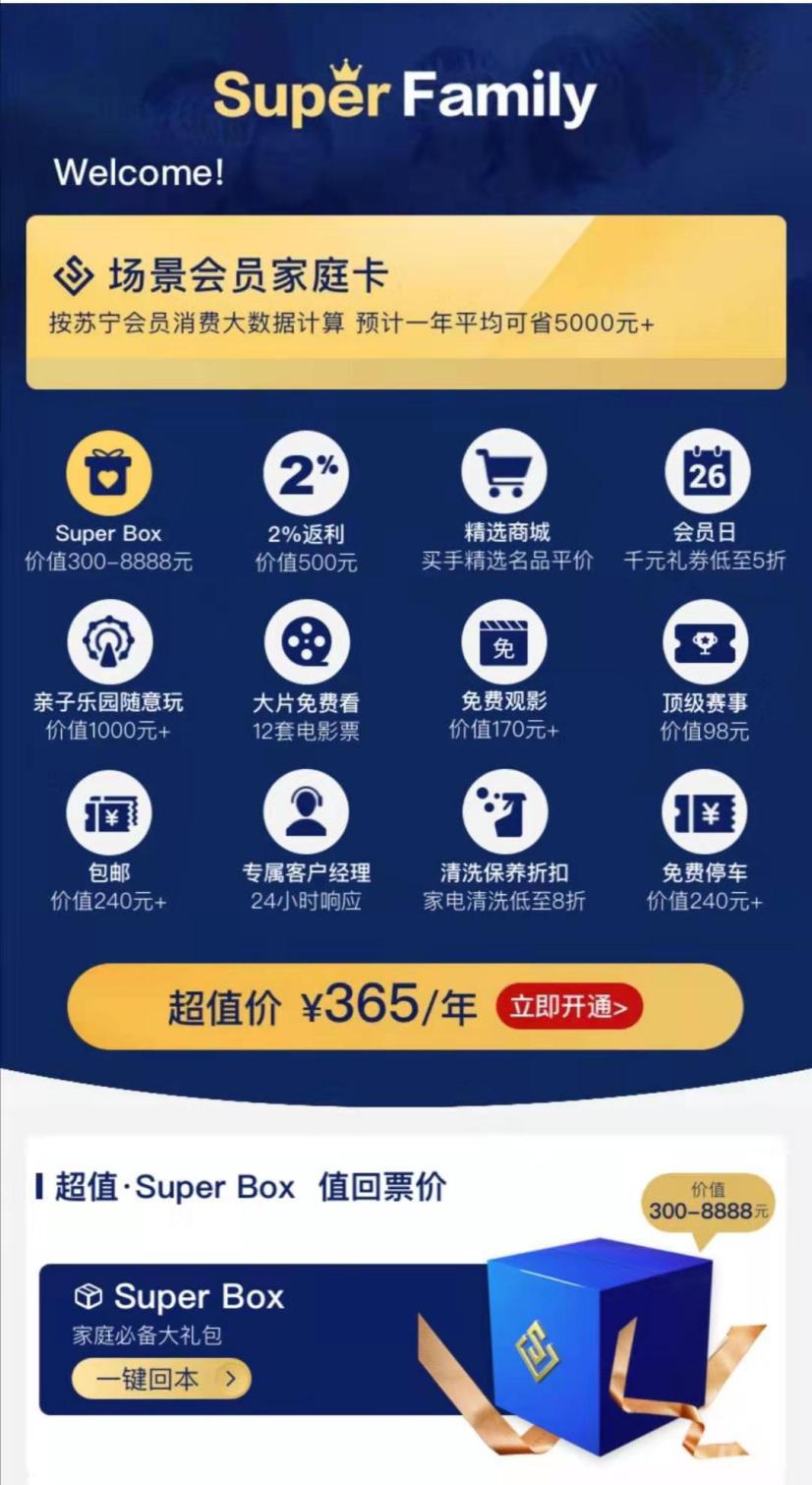 “在設(shè)計(jì)這款會(huì)員產(chǎn)品時(shí),我們希望能觸達(dá)每一位家庭成員。”蘇寧相關(guān)負(fù)責(zé)人解釋說:“比如媽媽,她用的更多的可能是購(gòu)物,那么家庭會(huì)員有購(gòu)物2%的返利;爸爸可能喜歡體育,我們有頂級(jí)賽事的觀賽劵贈(zèng)送;對(duì)于孩子,我們提供了免費(fèi)游玩樂園、免費(fèi)看電影、免費(fèi)停車等福利,讓全家人盡情享受親子時(shí)光。”