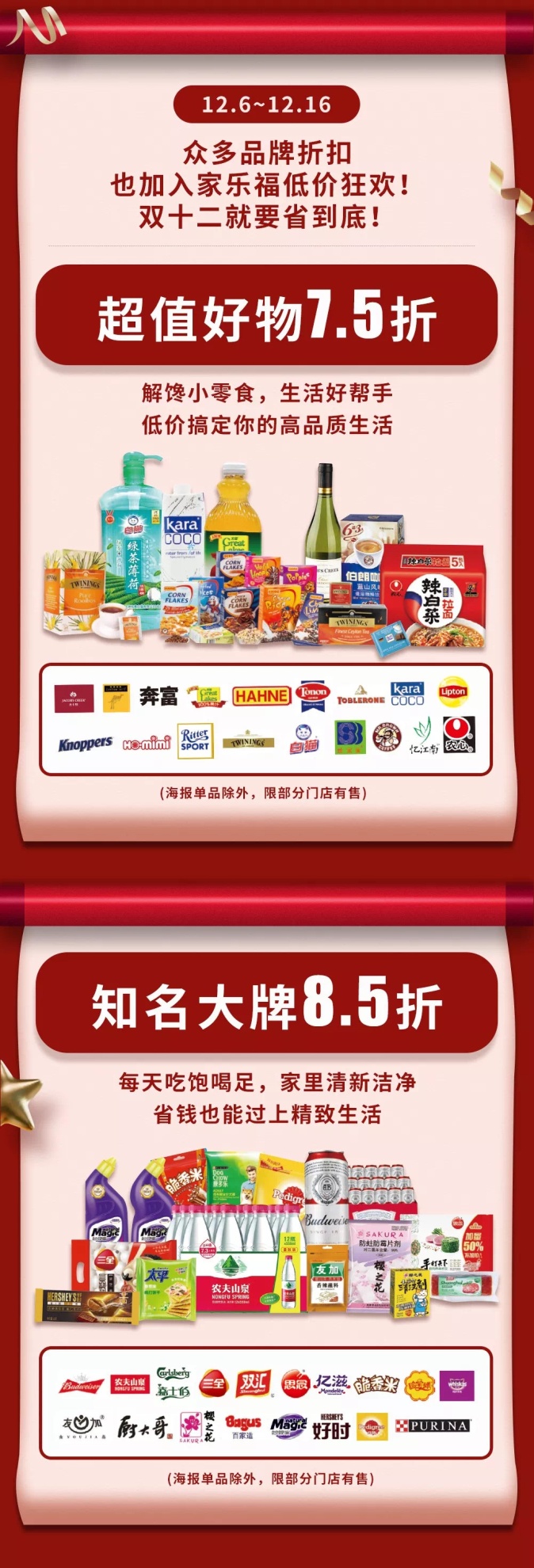 12月6日至16日,奔富、袋鼠、大湖、白貓、立頓、農心、伯朗咖啡、憶江南等知名品牌商品,推出限時7.5折。百威、農夫山泉、三全、雙匯、億滋、好時、偉嘉等大牌商品,奉上限時8.5折。寶潔系列產品,組合購買,滿減更加優(yōu)惠;聯合利華系列產品,兩件折扣、勁爆組合價、買一送一歡樂購。