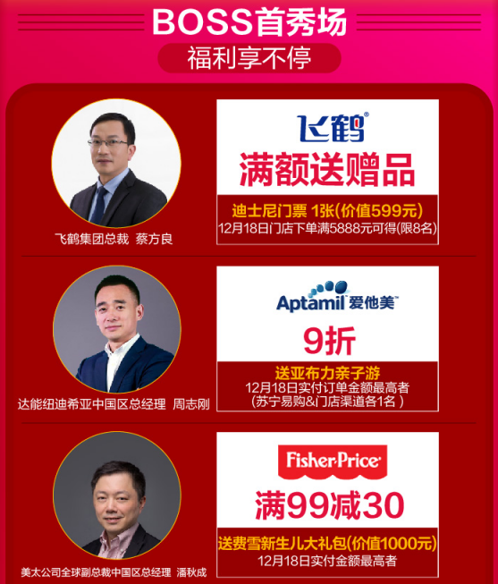12月18日,蘇寧紅孩子打造了線上線下雙線齊發(fā)的“年終狂歡搶購(gòu)盛典”。母嬰品牌大佬帶頭發(fā)福利,飛鶴集團(tuán)總裁蔡方良、達(dá)能紐迪希亞中國(guó)區(qū)總經(jīng)理周志剛、美太公司全球副總裁中國(guó)區(qū)總經(jīng)理潘秋成、寶潔大中華區(qū)幫寶適副總裁任遠(yuǎn),金佰利大中華區(qū)董事總經(jīng)理Mike等豪送價(jià)值十萬大禮?;顒?dòng)當(dāng)天,購(gòu)相應(yīng)品牌產(chǎn)品且實(shí)付金額最高者就能將戴森吹風(fēng)機(jī)、老鳳祥黃金、迪士尼門票等大禮免費(fèi)帶回家。