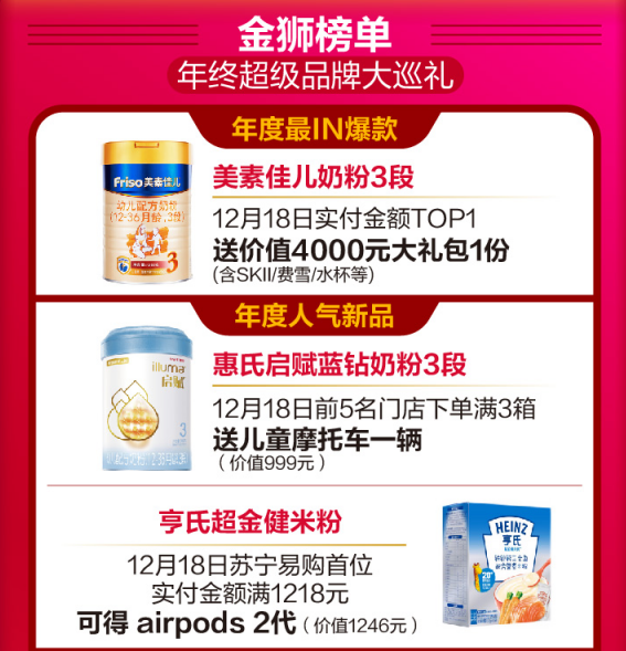 蘇寧紅孩子金獅榜單上,年度最I(lǐng)N爆款、人氣新品、超級(jí)品牌大巡禮,全是親子家庭想要的。寶媽寶爸購(gòu)美素佳兒奶粉3段且實(shí)付金額TOP1的用戶將免費(fèi)獲得價(jià)值4000元大禮包一份;單會(huì)員ID購(gòu)買惠氏藍(lán)鉆系列奶粉實(shí)付金額最高且滿3999元,就送祖馬瓏圣誕限量香氛禮盒一套;購(gòu)買飛鶴奶粉首位且實(shí)付金額滿8888元的消費(fèi)者將獲得華為NOVA5G一個(gè)。此外,亨氏、樂可愛、費(fèi)雪、小豬班納、好奇等母嬰品牌都有超值驚喜和好禮相送。