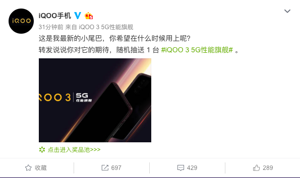 不僅如此,iQOO官博還在近期發(fā)布了一條“ UFS3.1用起來真快,二月見哦!”的微博,進一步肯定了iQOO3的即將到來,并將搭載UFS3.1頂級閃存芯片的事實。這是繼iQOO Neo855版采用UFS3.0閃存領先業(yè)界后的再次升級,進一步提升和鞏固了iQOO3的5G性能旗艦定位。