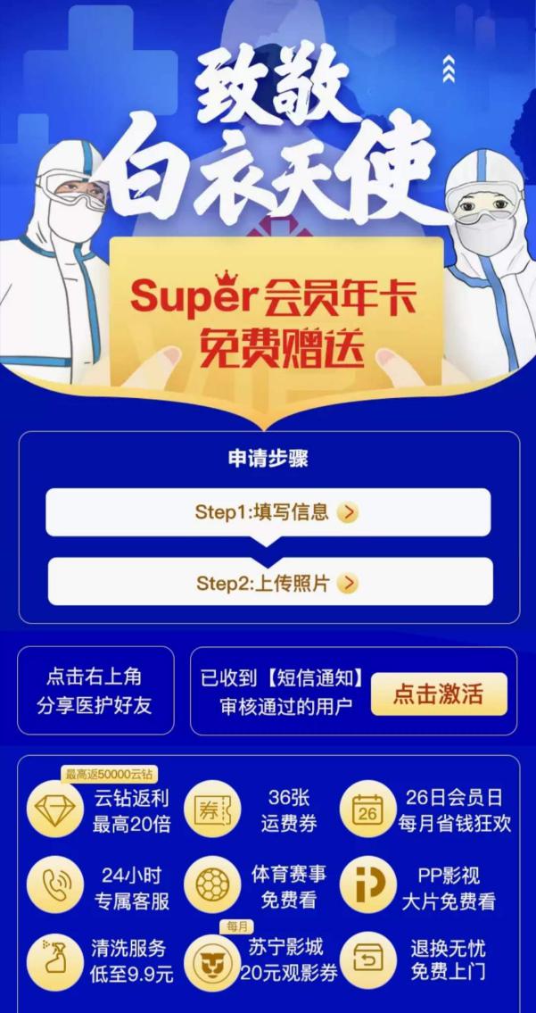 3月30日,蘇寧宣布加碼此次活動,Super會員贈送對象不僅包括具備執(zhí)業(yè)資格證書的醫(yī)生和護(hù)士,還包括藥師和技師,藥師和技師包含不限于放射影像科技師、檢驗科技師、口腔科技師、藥劑師、康復(fù)治療師等。消息發(fā)布后,藥師申請人數(shù)日均環(huán)比增長達(dá)89%,技師申請人數(shù)日均環(huán)比增長達(dá)145%。醫(yī)院行政、公共衛(wèi)生醫(yī)師、感染管理、海關(guān)衛(wèi)生檢疫人員、救護(hù)車駕駛員、心理治療師、醫(yī)院信息科工程師等人員也紛紛遞交申請。