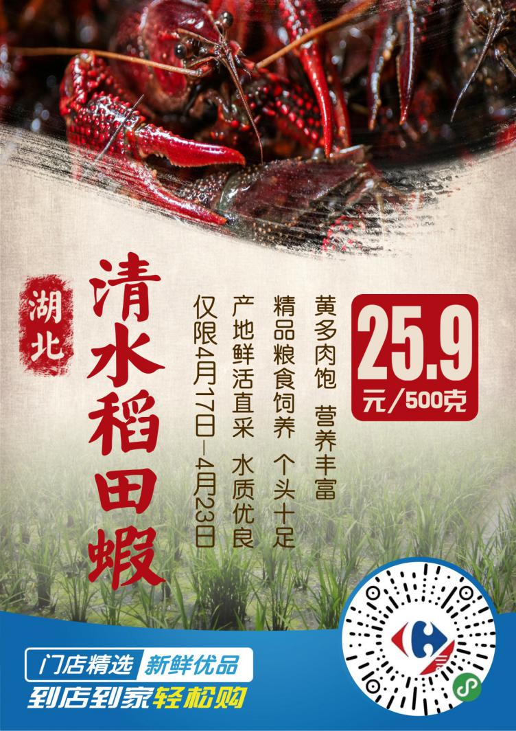 15號(hào)開(kāi)始捕撈的這批湖北“清水稻田蝦”將于16號(hào)完成分揀裝車(chē),發(fā)往家樂(lè)福全國(guó)各地大倉(cāng),17號(hào),家樂(lè)福位于北京,上海、哈爾濱,長(zhǎng)沙,成都,昆明,廣州,深圳等地的155家門(mén)店鮮活開(kāi)售,恰逢家樂(lè)福418購(gòu)物節(jié),嘗鮮價(jià)低到25.9元/500克(僅限4月17日至23日)。同時(shí),顧客還可以通過(guò)家樂(lè)福小程序、蘇寧易購(gòu)app、蘇寧小店App、及美團(tuán)、餓了么下單,享受1小時(shí)送到家的極致“鮮“體驗(yàn)。