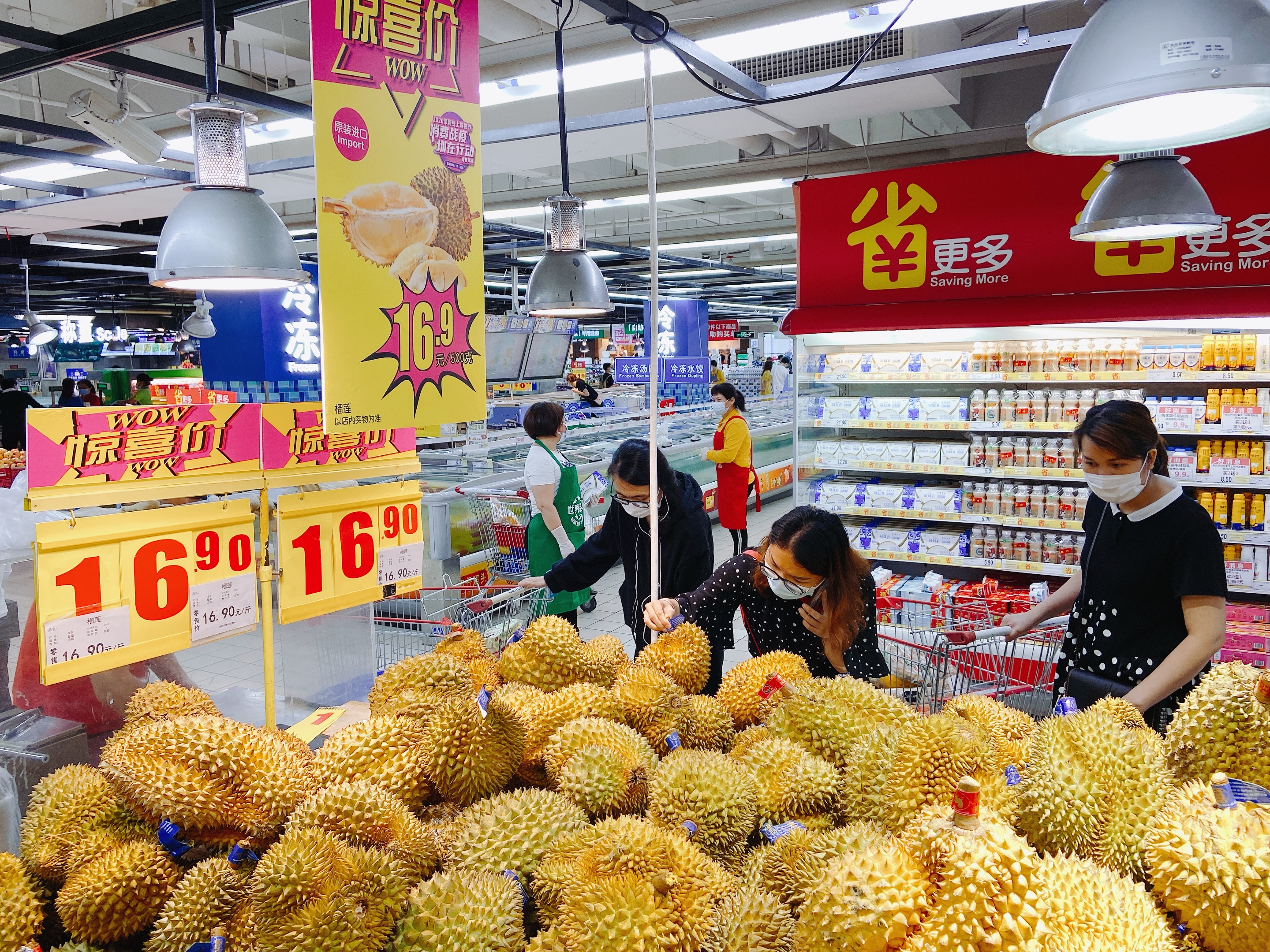 4月19日,記者來(lái)到家樂(lè)福一門(mén)店實(shí)地探訪(fǎng)。剛一步入生鮮區(qū)域,便被“泰國(guó)進(jìn)口榴蓮,白菜價(jià)16.9一斤”的促銷(xiāo)口號(hào)所吸引。整個(gè)生鮮區(qū)不乏各色接地氣的促銷(xiāo)口號(hào),吆喝聲此起彼伏,吸引不少消費(fèi)者駐足選購(gòu)?!皠偵鲜械奶﹪?guó)金枕頭,你看這個(gè)個(gè)頭、還有這個(gè)味道你聞聞,(每斤)只要16.9,比我們小區(qū)附近的生鮮超市還便宜”,一位受訪(fǎng)者對(duì)高性?xún)r(jià)比的泰國(guó)榴蓮贊不絕口。此次探店,記者聽(tīng)到消費(fèi)者最多的反饋是“品質(zhì)更好了,品種更多了”。家樂(lè)福深諳消費(fèi)者的需求,想要促進(jìn)消費(fèi),首先要給消費(fèi)者提供更多更好的選擇?!拔覀冞@次推出的’四月品鮮季’活動(dòng),有來(lái)自泰國(guó)、菲律賓等東南亞國(guó)家的反季水果,也有來(lái)自巴西、湖北的水產(chǎn)肉類(lèi)。16.9元一斤的泰國(guó)金枕榴蓮、4.9元一斤的菲律賓切割蕉、25.9元一斤的湖北清水稻田蝦這幾天一直占據(jù)暢銷(xiāo)榜前三的位置”,該店負(fù)責(zé)人介紹。