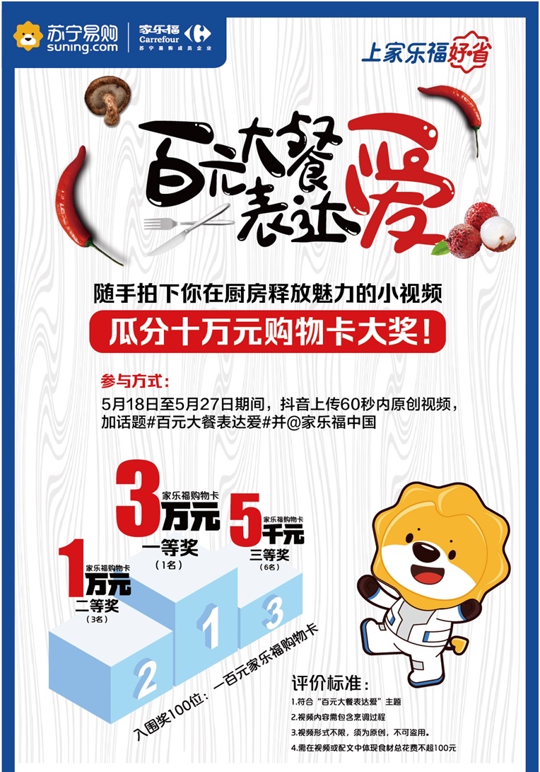近期陳老伯和女兒聊的最多的除了做菜,還有父女倆都很期待的一場比賽。據(jù)悉,5月18日至6月18日,家樂福將舉辦一場主題為“百元大餐表達(dá)愛”的鄰家大廚視頻PK賽,鼓勵(lì)參賽者做道有故事的菜,向摯愛的人表達(dá)濃濃的情意。你負(fù)責(zé)做菜,家樂福負(fù)責(zé)買單。你無需具備可媲美專業(yè)廚師的高超技藝,僅需擁有一顆熱愛美食的心和一雙巧手,無論是國人經(jīng)典標(biāo)配的“四菜一湯”,抑或是最適合情侶的西式浪漫—牛扒配紅酒,隨你發(fā)揮。以百元預(yù)算準(zhǔn)備食材,將烹調(diào)過程上傳抖音。屆時(shí),突圍選手將有機(jī)會(huì)瓜分價(jià)值十萬元的購物卡大獎(jiǎng)。