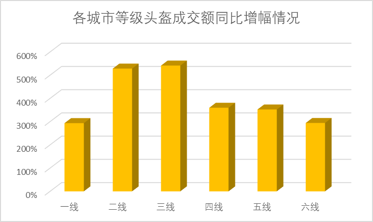 京東大數(shù)據(jù)顯示,5月以來,摩托車及電動車頭盔受到消費(fèi)者的廣泛關(guān)注,不僅搜索量達(dá)到了去年同期的8倍,成交額同比增幅也接近400%。其中,江蘇、河南、天津、云南地區(qū)頭盔的成交額都達(dá)到去年同期的10倍以上,上海、河北、寧夏、安徽地區(qū)頭盔的成交額達(dá)去年同期的8倍以上,廣東省成交額同比增幅125%。從各城市等級的頭盔消費(fèi)數(shù)據(jù)來看,二線及三線市場增速更為明顯。