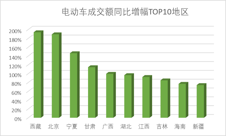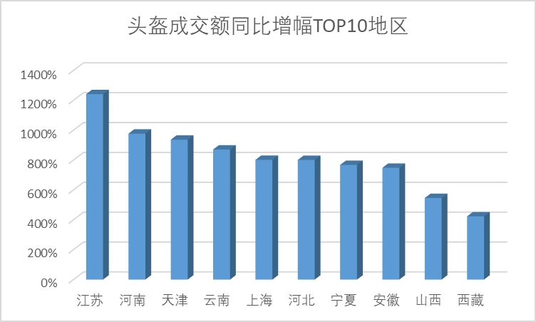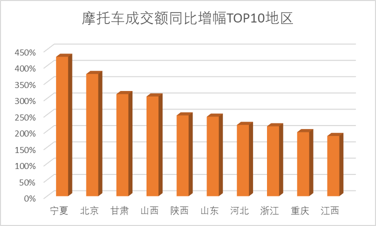 頭盔取得高速增長的同時(shí),摩托車、電動車的成交額增幅也分別超過110%和50%。寧夏、北京、甘肅、陜西等地區(qū)摩托車成交額同比增幅較高,而西藏、北京、寧夏、甘肅等地區(qū)的電動車成交額同比增幅較高。