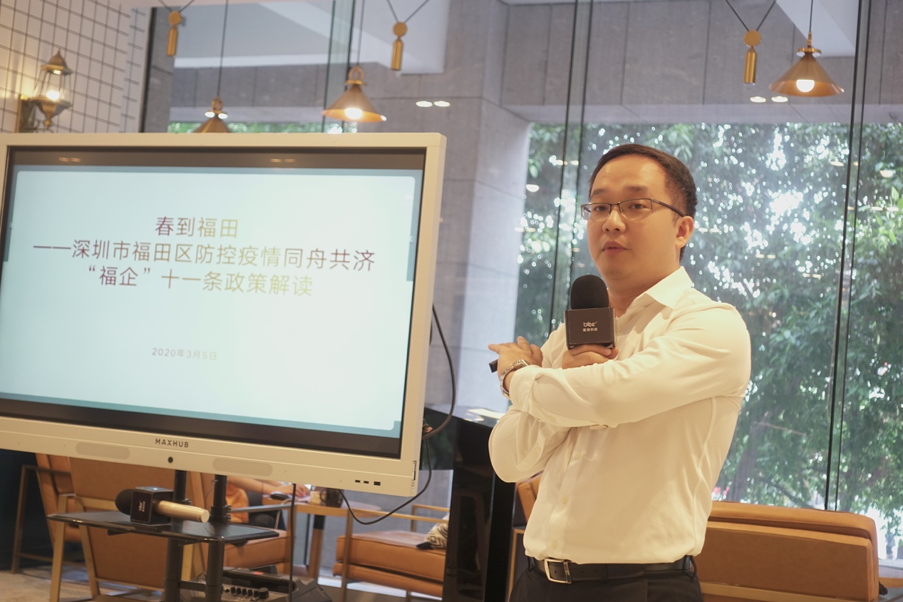 深圳市福田區(qū)財(cái)政局副局長林俊駒在分享會上指出,作為深圳最早研究提出企業(yè)復(fù)工復(fù)產(chǎn)的政府部門,深圳市福田區(qū)財(cái)政局第一時(shí)間啟動了應(yīng)急資金撥付機(jī)制和應(yīng)急政府采購機(jī)制,并快速印發(fā)工作指引,加強(qiáng)對各預(yù)算單位的業(yè)務(wù)指導(dǎo),以及對各單位和各區(qū)資金撥付的保障。據(jù)不完全統(tǒng)計(jì),在疫情發(fā)生以來,深圳市福田區(qū)政府共投入4億多元疫情防控物資購置及醫(yī)療救治經(jīng)費(fèi)等方面。在此次分享會上,面向入駐在BEEPLUS深圳財(cái)富大廈空間的企業(yè)會員,林俊駒副局長為與會企業(yè)解讀了福田區(qū)“福企”11條及新“福企”10條政策,強(qiáng)調(diào)區(qū)政府又另行投入10億支持福田區(qū)企業(yè)克疫前行。他表示,在未來,福田區(qū)政府將繼續(xù)為創(chuàng)新創(chuàng)業(yè)類企業(yè)提供強(qiáng)有力的政策支撐,加大支持力度。